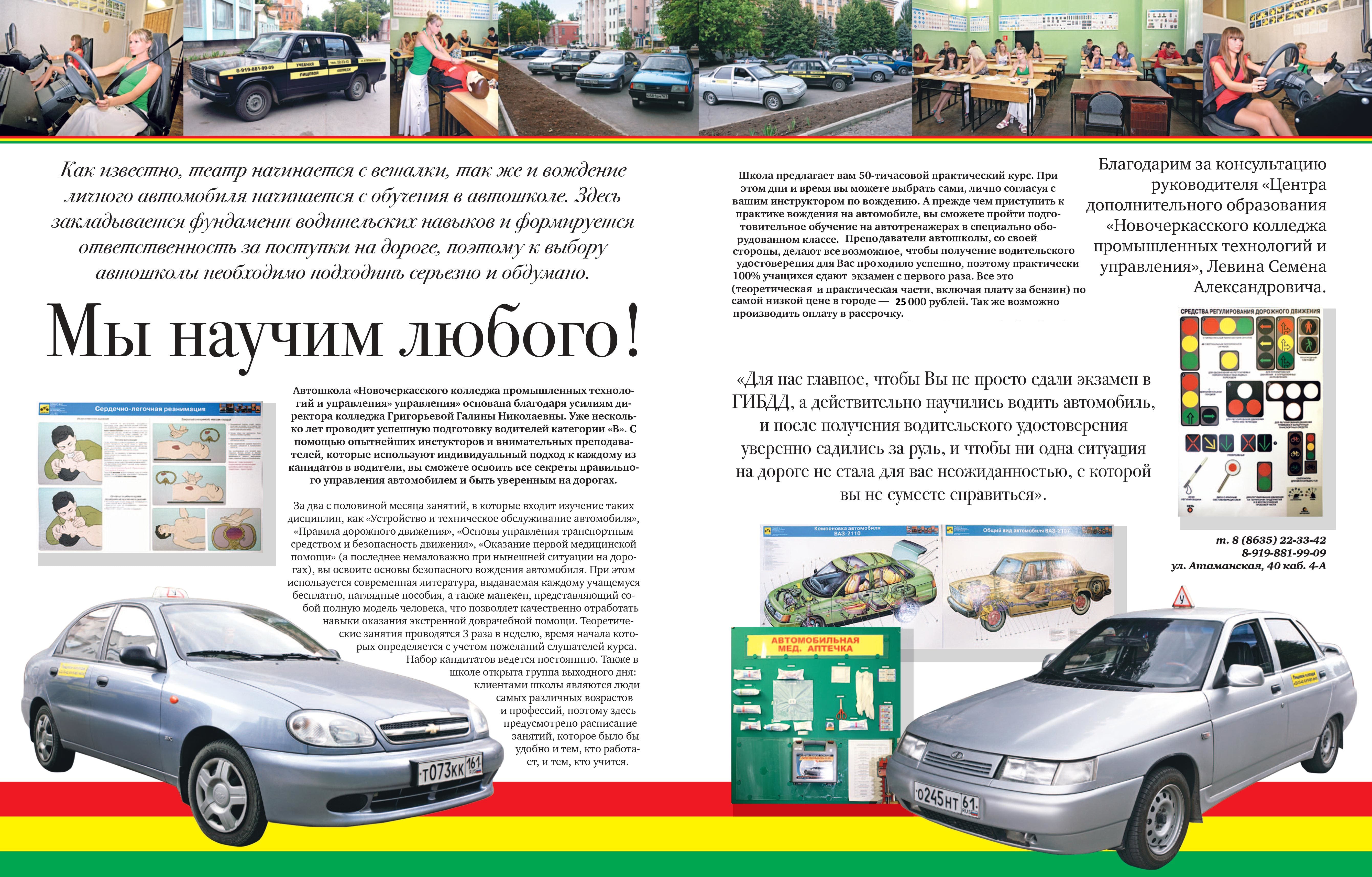 Государственное образовательное профессиональное учреждение Ростовской области «Новочеркасский колледж промышленных технологий и управления» (ГБПОУ РО «НКПТиУ») проводит подготовку водителей автотранспортных средств категорий «В» и «С» на основании Лицензии на осуществление образовательной деятельности 61Л01 № 0001634 от 01.10.2014г., регистрационный № 4041 Бессрочно., выданной Региональной службой по надзору и контролю в сфере образования Ростовской области.Обучение кандидатов в водители категории «В» ведется не менее 3 месяцев, категории «С» не менее 4 месяцев по программе, утвержденной Министерства образования и науки Российской Федерации, согласованной с ГИБДД и Департаментом обеспечения безопасности дорожного движения Министерства внутренних дел РФ. В программу обучения входит полный курс практического обучения вождению автомобиля и теоретических основ.У нас работает коллектив инструкторов и преподавателей с педагогическим стажем от 7 лет.