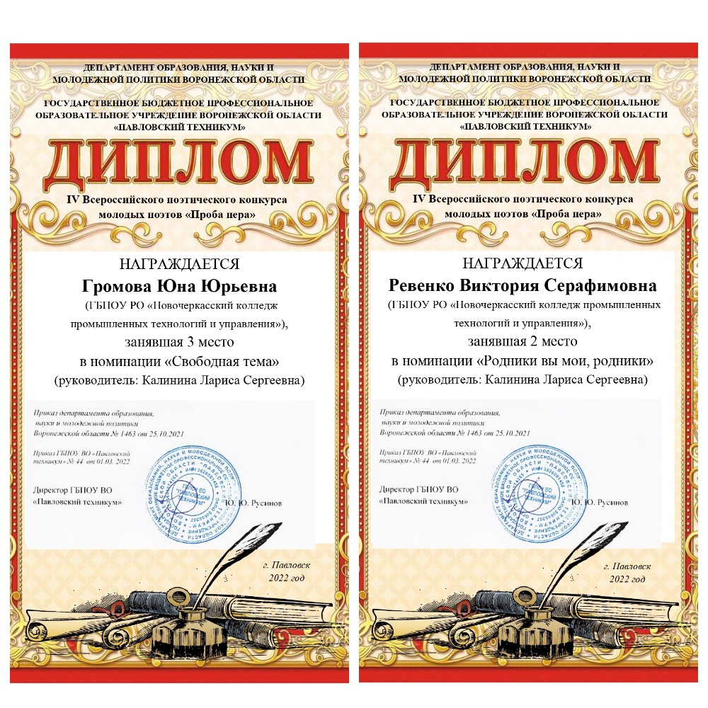 Студентки НКПТиУ Юна Громова (группа Вет-211) и Виктория Ревенко (группа Пб-211) под руководством преподавателя русского языка и литературы Ларисы Калининой, представили свои поэтические работы в номинациях «Родники вы мои, родники» и «Свободная тема».