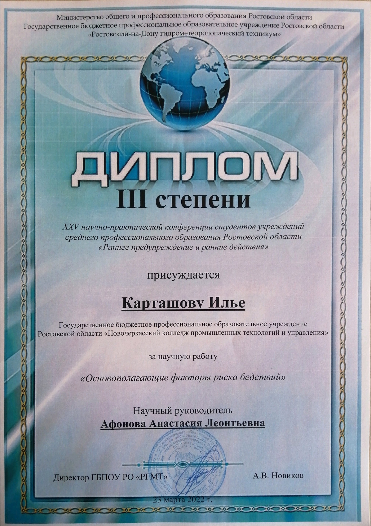 Студент НКПТиУ Илья Карташов принял участие в конференции под руководством преподавателя экологии и экологических основ природопользования Анастасии Афоновой. Он подготовил научную работу на тему «Основополагающие факторы риска бездействий».