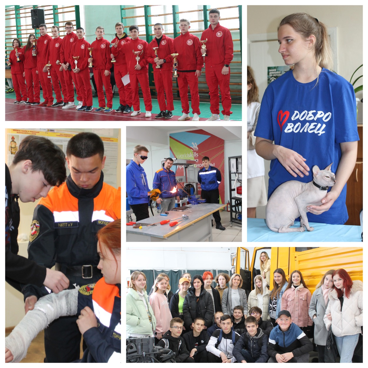 На входе в спортзал ребята увидели зрелищные приёмы рукопашного боя от студентов НКПТиУ. А дальше их торжественно встречала целая вереница студентов-призёров состязаний городского, областного и федерального уровня в алых спортивных костюмах с надписью «НКПТиУ». И у каждого в руках - победный кубок!