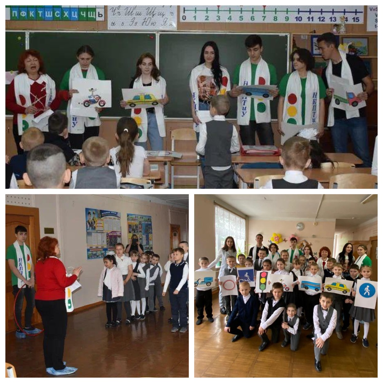 «Учения» для школьников в формате интерактивных занятий проводили активисты из агитбригады «Дорожный патруль» НКПТиУ вместе с автоинспектором ГИБДД Марией Астаховой.