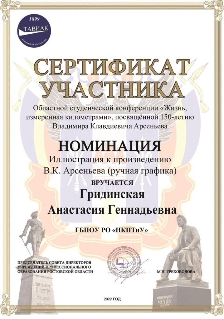 Студконференцию провели в заочной форме на базе ГБПОУ РО «Таганрогский авиационный колледж имени В.М.Петлякова». Студенты НКПТиУ Анастасия Гридинская, Вероника Семенова, Марк Чеботарев, Дарья Касейкина, Николай Овчаренко и Андрей Панченко участвовали в двух творческих номинациях «Иллюстрация к произведению Владимира Арсеньева» и «Владимир Арсеньев как фигура публичной памяти».