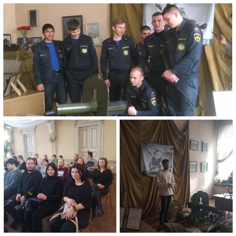 9 февраля участники военно-патриотического клуба «Мужество» (руководитель Галина Акимова), клуба интернациональной дружбы «Меридиан» (руководитель Светлана Колот) и студенты группы Зчс-203 с классным руководителем Еленой Труняковой побывали на выставке в городской библиотеке им. А.С. Пушкина «Этих дней не смолкнет слава», посвящённой 80-летию освобождения Новочеркасска от немецко-фашистских захватчиков.