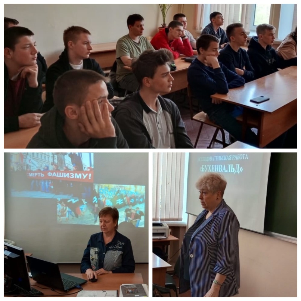 Среди студентов группы Св-221 преподаватели Татьяна Коноплева и Светлана Колот провели урок «Без срока давности». Студенты увидели документальные кадры, сделанные в Бухенвальде, одном из крупнейших концентрационных лагерей в Германии. Татьяна Геннадьевна поделилась с ребятами своими впечатлениями от посещения музея, который создан на базе бывшего лагеря смерти. Рассказала об ужасах, которые пришлось пережить пленным.