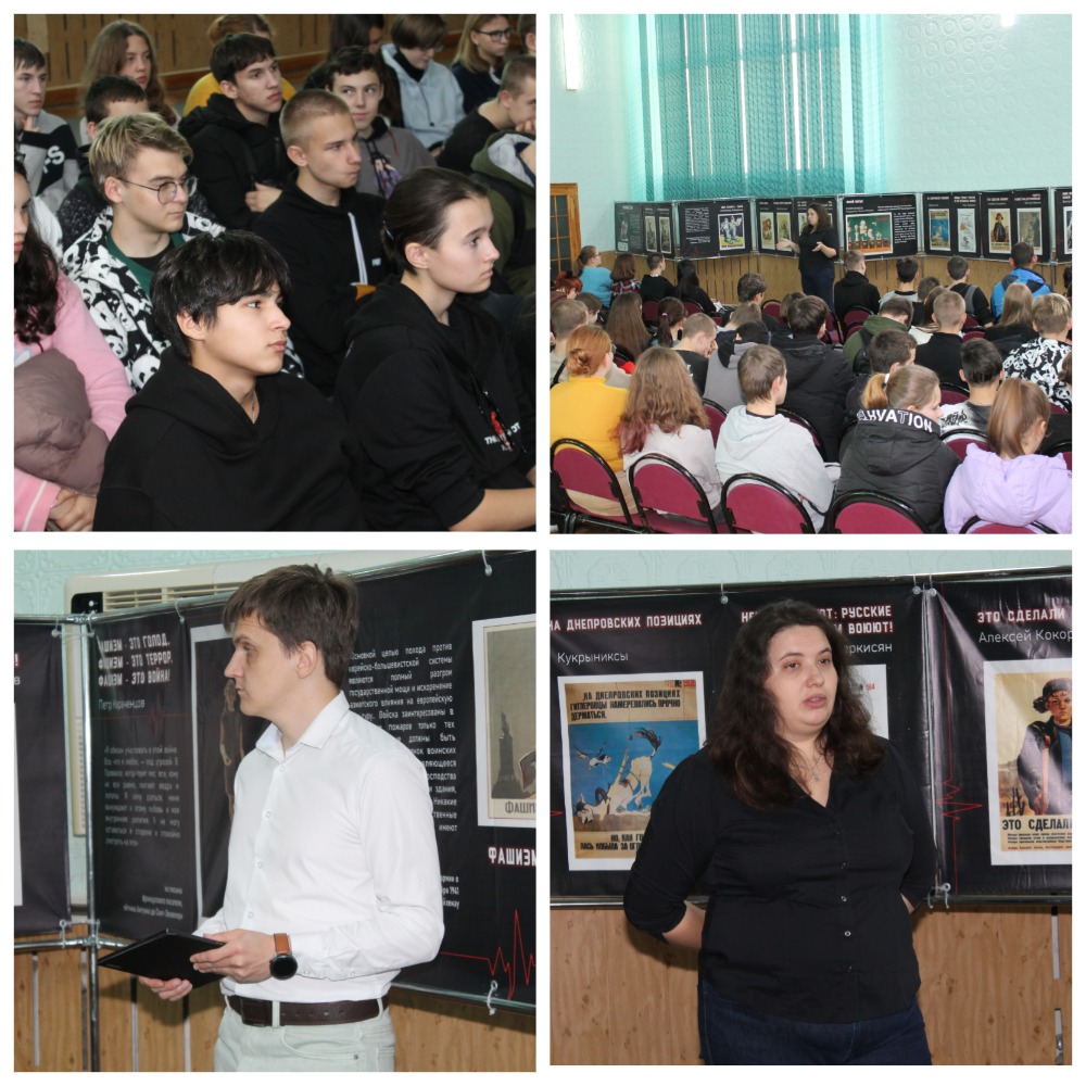 Организаторы выставки и авторы проекта - члены культурного клуба «Восхождение» Татьяна Загороднюк и Дмитрий Тимонин - председатель Новочеркасского отделения движения «Суть времени» рассказали студентам колледжа о роли плакатной агитации во время войны и возвращении нацизма в наши дни. Лекции посетили почти все студенты НКПТиУ.