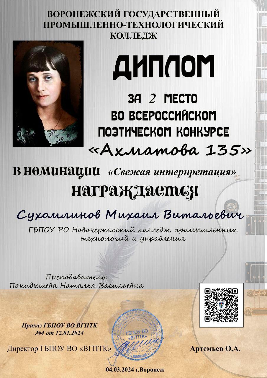 Именно её творчеству был посвящён Всероссийский поэтический конкурс «Ахматова - 135», проведённый на базе Воронежского промышленно-технологического колледжа.