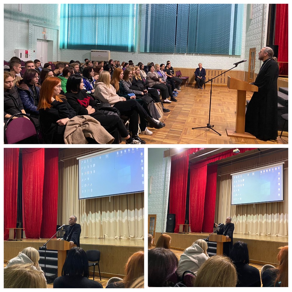 В Новочеркасском колледже промышленных технологий и управления состоялась встреча студентов со священнослужителем храма Донской иконы Божьей Матери — отцом Александром. Встреча была посвящена одной из самых важных тем в жизни каждого человека: «Ценности и смысл жизни».