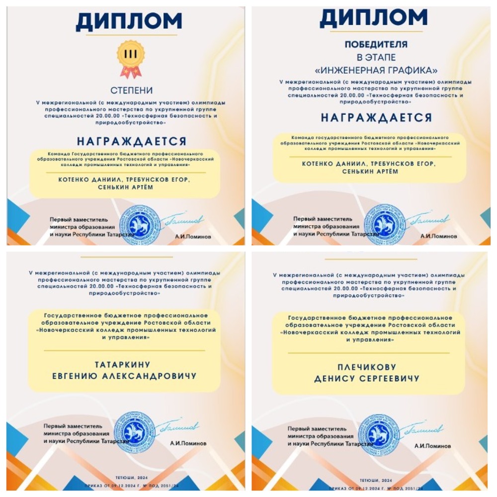 Представители Новочеркасского колледжа промышленных технологий и управления Даниил Котенко, Егор Требунсков и Артём Сенькин стали победителями олимпиады в этапе «Инженерная графика» и заняли третье место в общекомандном зачёте.