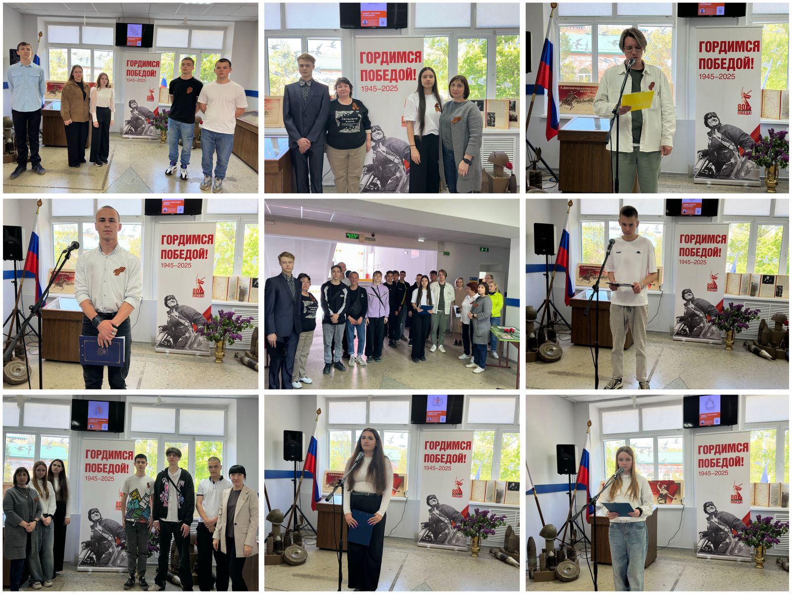 Студенты специальностей «Землеустройство», «Монтаж, техническая эксплуатация и ремонт холодильно-компрессорных и теплонасосных машин и установок» и «Мастер по ремонту и обслуживанию автомобилей» рассказывают стихотворения военной тематики, отдавая дань уважения героям и сохраняя историческую память.