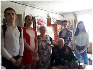 Волонтёры группы Зем-181 Нецветаева Вика, Леонова Дарья, Дроздова Елена, Мылай Данил и Мелехин Стас взяли шефство над семьей ветерана Великой Отечественной войны Конюхова Николая Михайловича. В течение года ребята помогали по дому и в саду, в праздник Победы поздравили ветерана и поблагодарили его за подвиг и мужество и мирное небо.