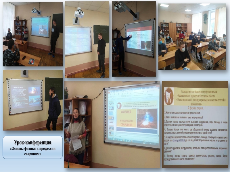 17 ноября 2020 года в рамках недели Агротехнического отделения преподавателем физики Ейст Н.А. был проведён урок-конференция «Основы физики в профессии сварщика» для студентов второго курса профессии 15.01.04 «Наладчик сварочного и газоплазмарезательного оборудования» (группа Нс-191). Целью данного мероприятия явились анализ и систематизация теоретических знаний, полученных в процессе изучения таких разделов физики как «Механика», «Молекулярная физика», «Термодинамика и электродинамика», и применение их при объяснении различных видов сварки.