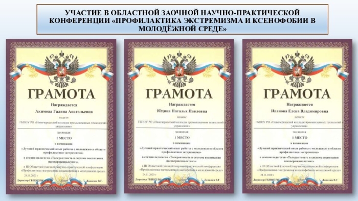 По итогам конференции преподаватели колледжа заняли первое место в номинации «Лучший практический опыт работы с молодёжью в области профилактики экстремизма» в секции «Толерантность в системе воспитания несовершеннолетних». Участники конференции награждены грамотами.