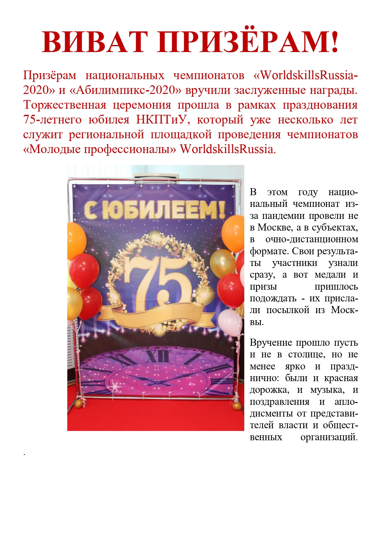 Призёрам национальных чемпионатов «WorldskillsRussia-2020» и «Абилимпикс-2020» вручили заслуженные награды. Торжественная церемония прошла в рамках празднования 75-летнего юбилея НКПТиУ, который уже несколько лет служит региональной площадкой проведения чемпионатов «Молодые профессионалы» WorldskillsRussia.ПОДРОБНЕЕ...