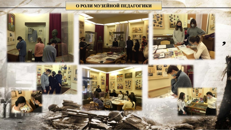 Музей в современном обществе не только научно-просветительское уч-реждение, но и центр культуры, решающий задачи развития и воспитания личности. Музеи одновременно влияют на интеллект, вырабатывают качества, такие как волю, эмоционально влияют на личность подростка, а каждая экспозиция представляет собой программу передачи знаний, навыков, суждений, оценок и чувств. Именно поэтому музейную педагогику можно рассматривать, как интегративную и качественно новую сферу образовательной деятельности, инновационную педагогическую технологию. Именно для этих целей в НКПТиУ функционирует Музей боевой и трудовой славы колледжа.