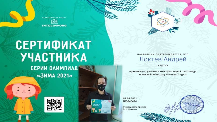 В конце февраля студент Агротехнического отделениягруппы Нс-191(Локтев А., преподаватель по физике Ейст Н.А.) принял участие в международной интернет-олимпиаде«Зима 2021» по физике. Итоги олимпиады подведены 3 марта 2021 года. По итогам Олимпиады Локтев А. получил сертификат участника. Отметим, что онлайн-олимпиада – это отличный способ для обучающихся проверить свои знания, показать себя, получить новый интересный опыт в учебном процессе.