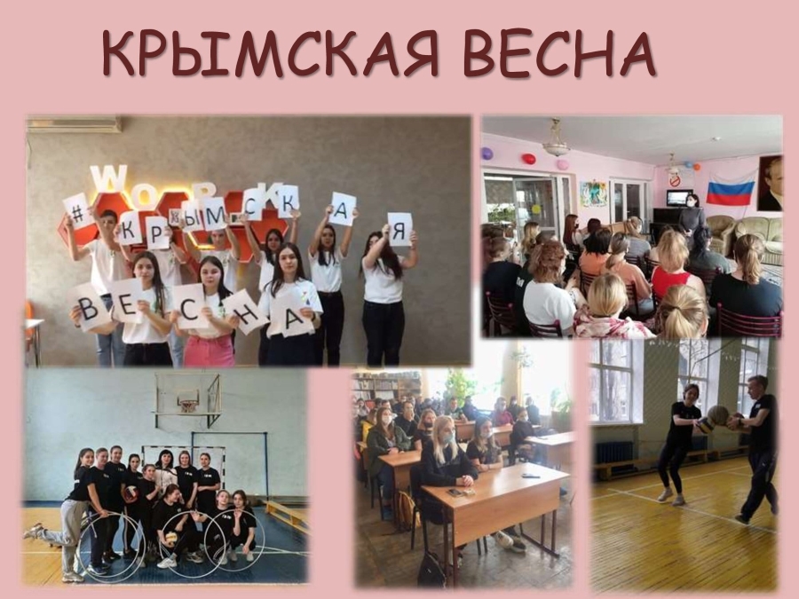 С целью формирования патриотических чувств и развития интереса молодого поколения к изучению истории, преподавателями проведен цикл познавательных мероприятий «История Крымской весны», для обучающихся колледжа, посвященных Дню воссоединения Крыма с Россией. В основу мероприятий вложена жизнь российско-крымского народа, на котором присутствующие узнали о культуре, истории, экономике, флоре и фауне Крыма. А также об истории возвращения полуострова Крым и города Севастополь в состав России. Волонтерский отряд «Единство» провели флешмоб под названием «Мы едины». Воспитатели в общежитиях колледжа продемонстрировали фильм для студентов - «Крым Путь на родину». Проведенные мероприятия в рамках празднования Крымской весны, подарили ребятам хорошее весеннее настроение и яркие впечатления.