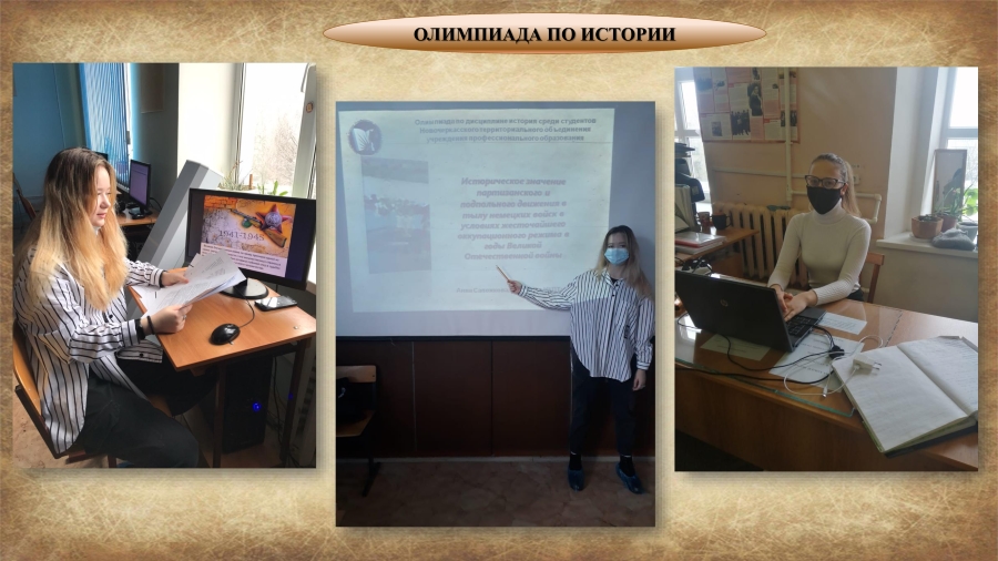 22-24 марта 2021 года проходила олимпиада по дисциплине «Исто-рия» среди студентов Новочеркасского территориального объединения учреждений профессионального образования. Конкурсная программа Олимпиады предусматривала два этапа. Первый этап включал тестирование, второй – письменный ответ участника на проблемный вопрос по теме «Великая Отечественная война 1941-1945 гг.». По итогам Олимпиады победителем стала студентка отделения «Экономики и управления» группы Одл-201 Овчаренко К. (научный руководитель Сарахатунова Л.П.). Второе место у студентки Агротехнического отделения группы Вет-203 Сапожковой А. (научный руководитель Акимова Г.А.).