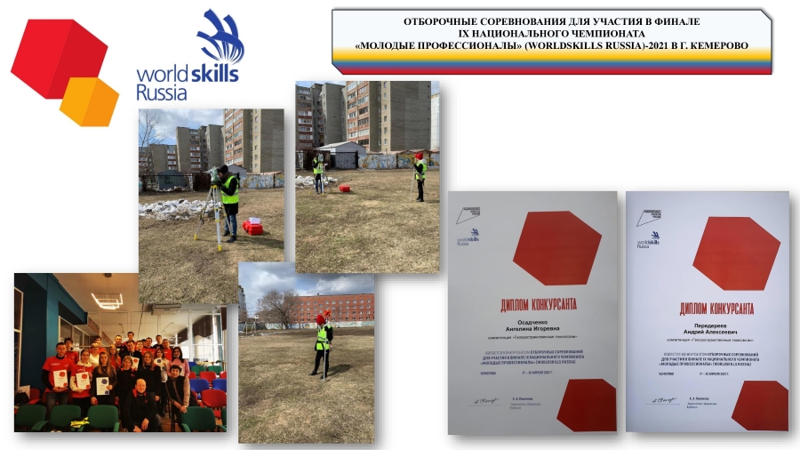 С 17 по 30 апреля2021 годав г. Кемерово проходят отборочные соревнования для участия в финале IX Национального чемпионата Молодые профессионалы (WorldSkillsRussia)-2021. 21 апреля 2021 годана чемпионате компетенцию «Геопространственные технологии» от Новочеркасского колледжа промышленных технологий и управления представляли студенты Агротехнического отделения группы Зио-203 Осадченко А. и Передереев А. В соревнованиях ребята продемонстрировали свои теоретические знания и практические умения, выполняя конкурсное задание. По итогу отборочных соревнований Осадченко А. и Передереев А. получили дипломы конкурсантов. Подготовка студентов осуществлялась преподавателем дисциплин про-фессиональных модулей Тарасовым С.А. В период подготовки и участия студенты изучали современные технологии и лучшие
