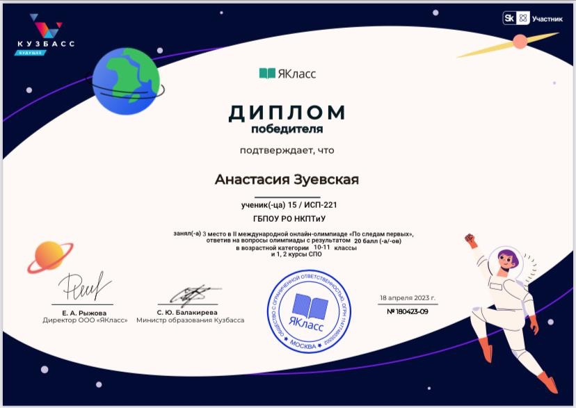 Студентка Новочеркасского колледжа промышленных технологий и управления завоевала третье место на II Международной онлайн-олимпиаде «По следам первых».