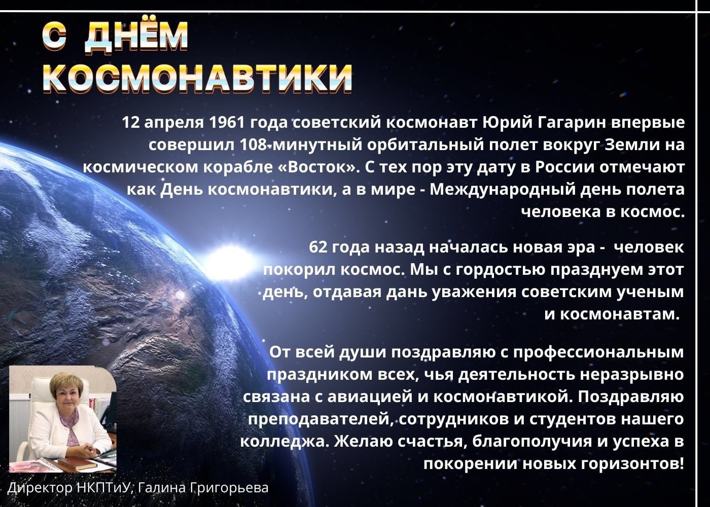 Сегодня мы поздравляем с профессиональным праздником всех мужественных и верных долгу людей, чья повседневная работа связана с небом, авиацией и космонавтикой. Пусть ваши мечты и стремления всегда будут высокими, ваше здоровье и самочувствие позволяет вам на долгие годы быть в строю, а ваши близкие радуют вас заботой и теплотой души.