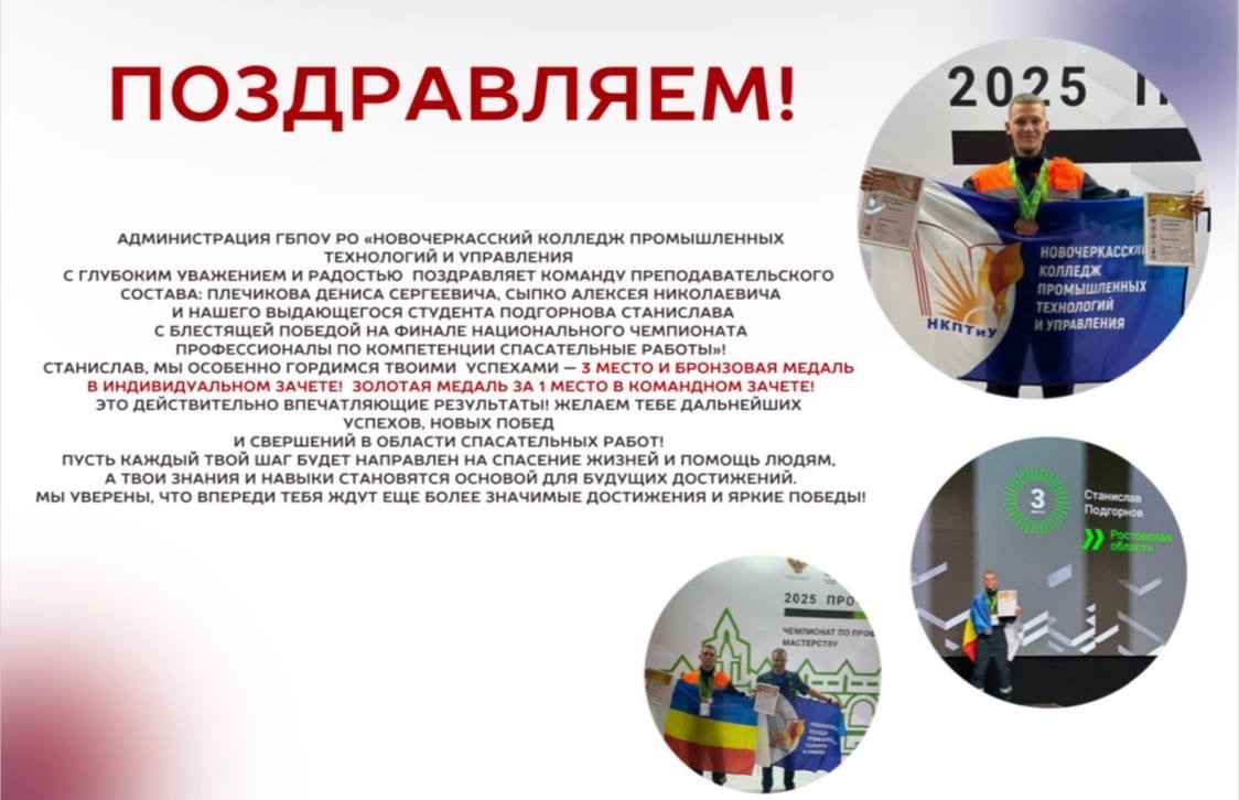 Администрация ГБПОУ РО «Новочеркасский колледж промышленных технологий и управления с глубоким уважением и радостью поздравляет команду преподавательского состава: Плечикова Дениса Сергеевича, Сыпко Алексея Николаевича и нашего выдающегося студента Подгорнова Станислава с блестящей победой на Финале Национального Чемпионата Профессионалы по компетенции «Спасательные работы»!