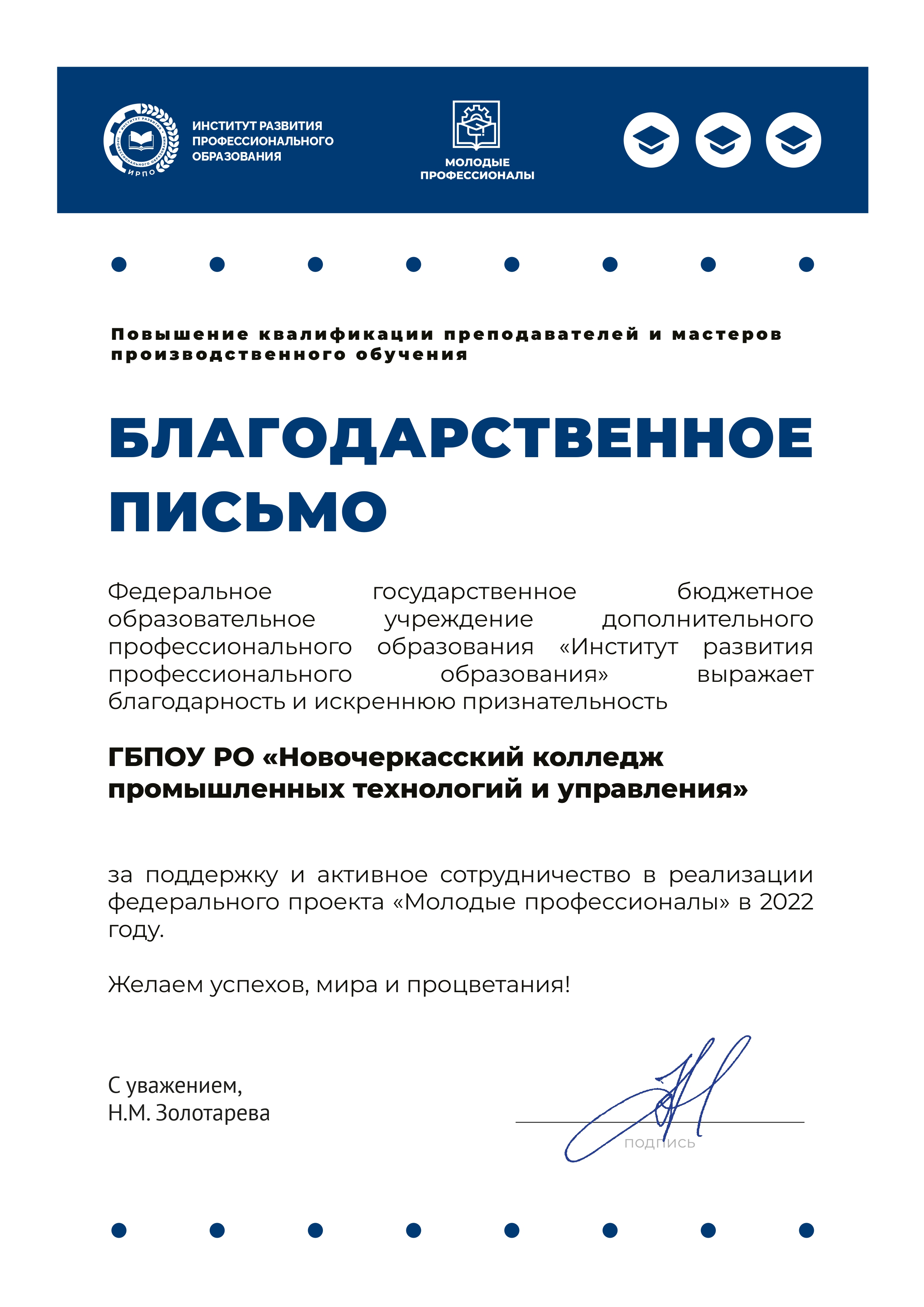 За поддержку и активное участие в реализации проекта в 2022 году НКПТиУ получил благодарственное письмо от Института развития профессионального образования.