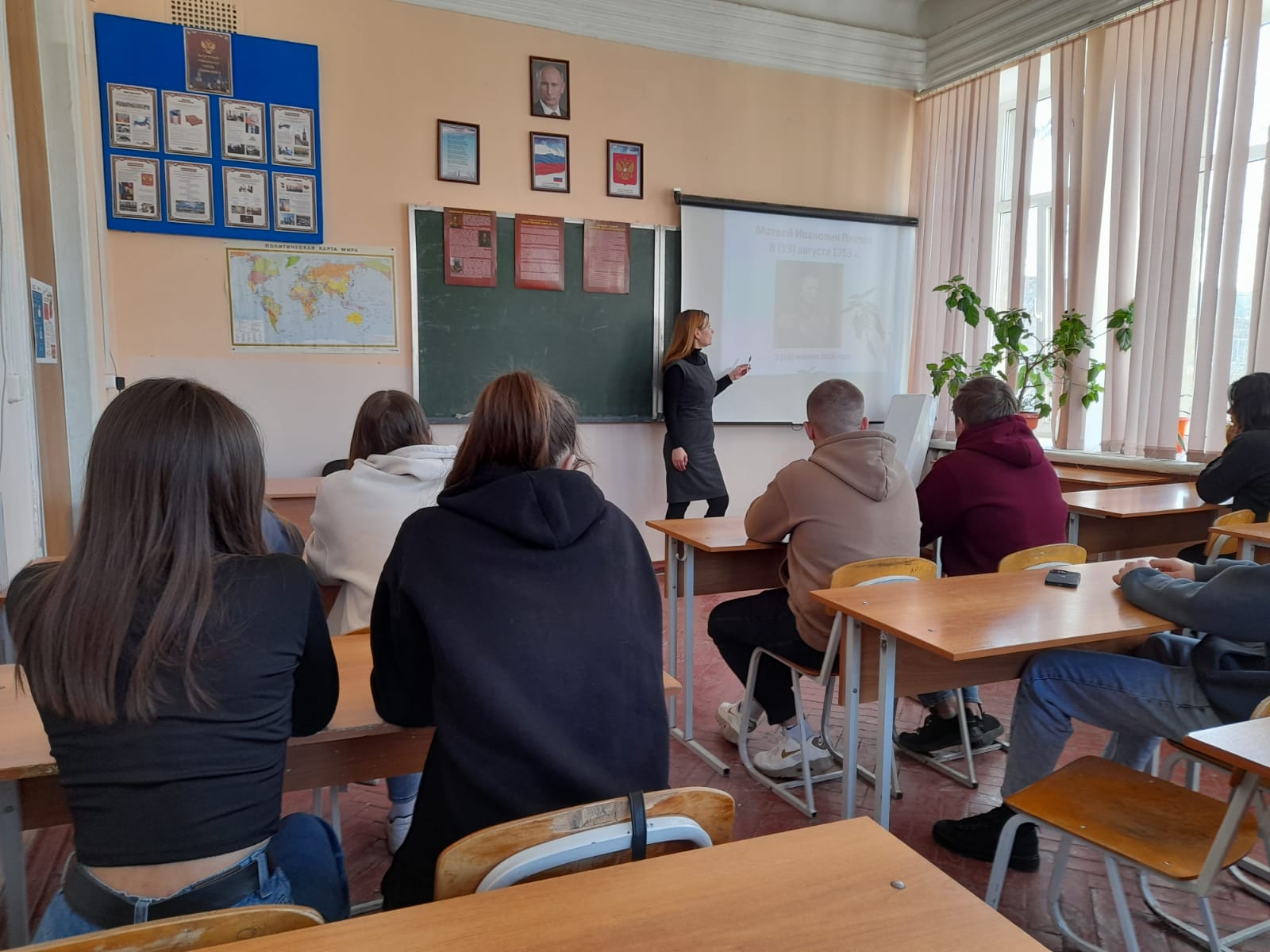 В ходе интерактивной лекции ребята узнали основные вехи жизни и деятельности основателя Новочеркасска. Студентам показали Матвея Ивановича как военного и как атамана Войска Донского. Будущие землеустроители познакомились с боевыми подвигами вихорь-атамана, увидели фотографии его военных наград и других мемориальных вещей, которые хранятся в фондах музея истории Донского казачества.