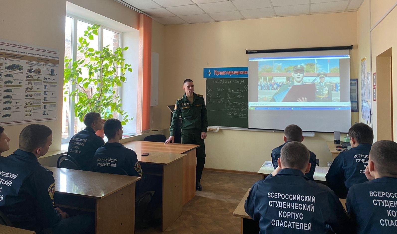 Курсант учебного заведения, Семён Маслов, провёл с ребятами из групп Зчс-201, Пб-201, Зчс-191 профориентационную беседу. Студенты узнали о возможности поступления в военное училище после окончания колледжа, критериях отбора, правилах приема и сроках подачи документов. Также ребятам рассказали о престижности офицерского звания, которое получают выпускники училища.