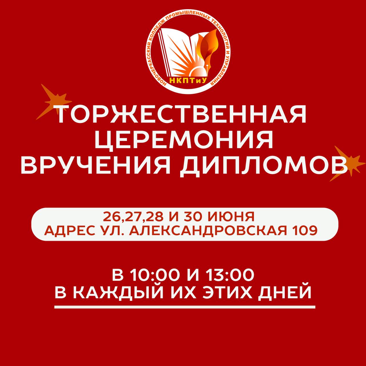 С радостью приглашаем вас на торжественную церемонию вручения дипломов. Долгожданное событие состоится 26, 27, 28 и 30 июня 2025 года в нашем колледже по адресу ул. Александровская, 109.