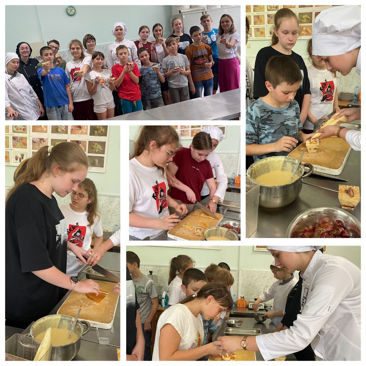 Для подростков задачу максимально облегчили: тесто они не месили и не пекли, а резали кубиками уже готовый, заранее приготовленный студентами и преподавателями НКПТиУ бисквит. Крем тоже не взбивали, а только выцеживали из кондитерского мешка. Затем добавили малиновый джем, нарезали и украсили виноградом – вот и готово!