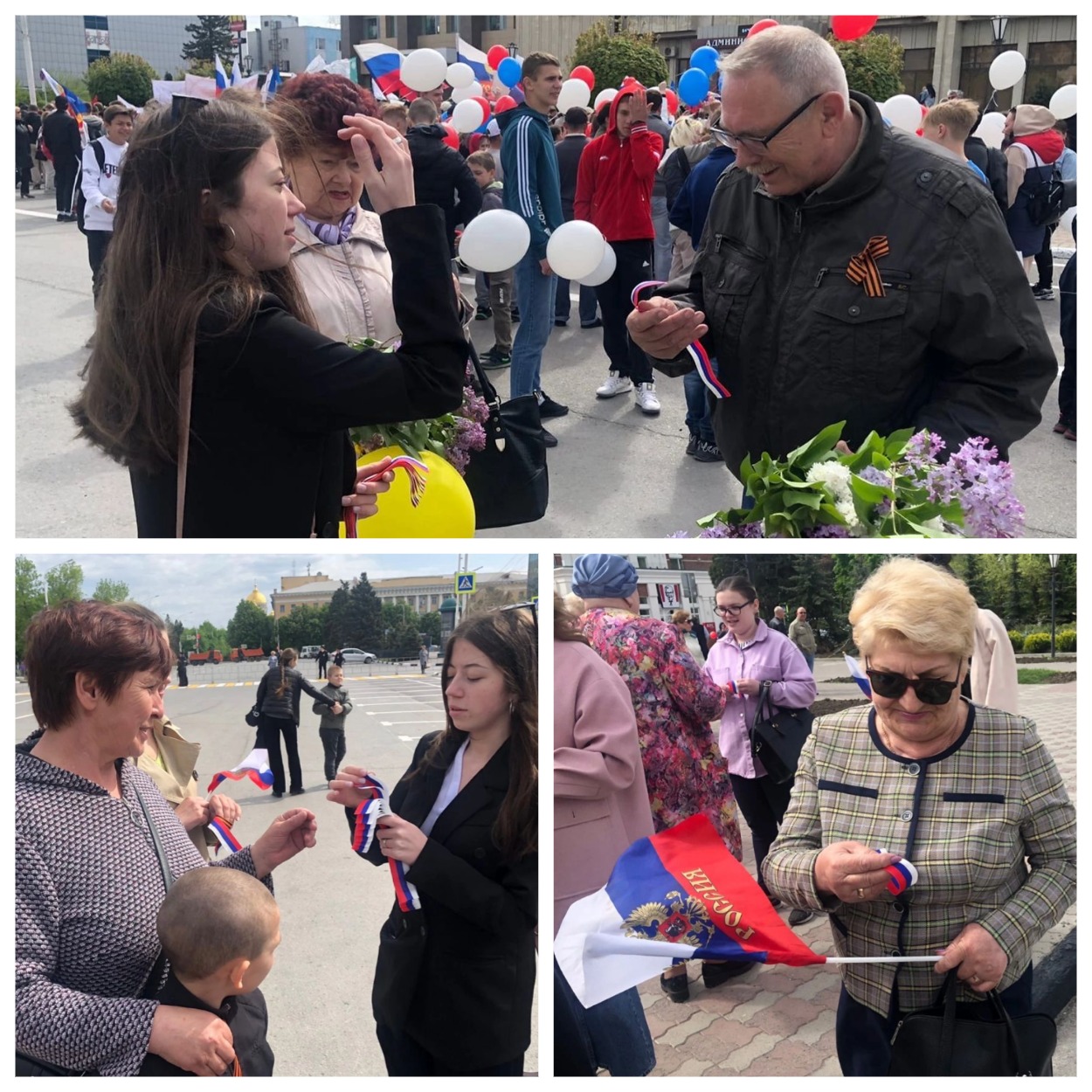 С утра 1 мая ленточки цвета флага России наши добровольцы раздавали на центральной площади города во время праздничного концерта. В ходе мероприятия активисты поздравляли новочеркасцев с Первомаем и рассказывали об истории возникновения праздника.