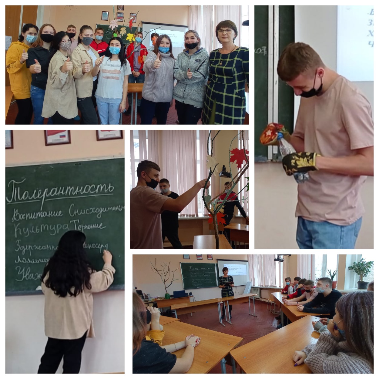 В колледже отметили день толерантности. Собравшимся в актовом зале прикрепляли символические «цветы толерантности» и раздавали листовки. Прозвучали стихи о толерантности и Гимн демократической молодежи мира. Кроме того, студенты узнали об истории праздника и почему нетерпимость – одна из основных угроз современному обществу.