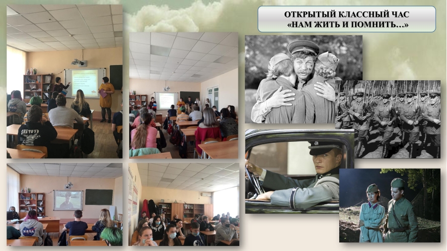 В группах Агротехнического и Технологического отделенийколледжа Зем-201 (классный руководитель Тревога И.Б.) и Пкд-191 (Богданова О.Ф.) проведён открытый классный час «Нам жить и помнить…» в форме дискуссионного клуба. В нашей стране нет такой семьи, которую бы не коснулось военное лихолетье. Поэтому Великая Отечественная война еще долго будет оставаться незаживающей раной в нашей памяти. Великая Отечественная война была самой тяжелой и кровопролитной из всех войн, когда-либо пережитых Советским Союзом. Однако она была не только драматическим, но и героическим периодом истории советского народа и не случайно названа Великой Отечественной. Летопись войны полна примеров мужества и героизма миллионов советских людей, самоотверженно защищавших свою родину. И чем дальше от того тревожного и героического времени, тем величественнее кажутся их подвиги, тем полнее осознается значимость совершённого. Целью классного часа явилось воспитание у обучающихся любви к своей Родине и её истории. Стихи о событиях войны сменялись фрагментами фильмов о войне, среди которых «Битва за Россию», «А зори здесь тихие…», «Мальчик в полосатой пижаме», «Мы из будущего». Завершён был классный час минутой молчания.