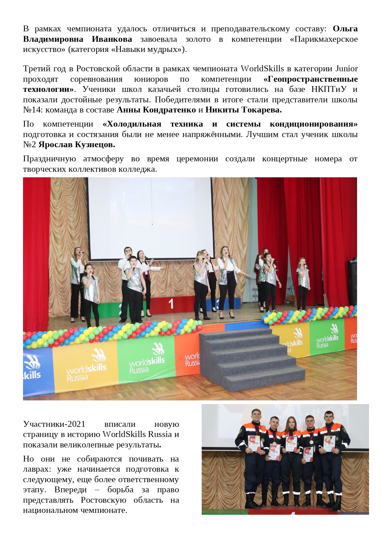 Пока участники напряжённо работают на площадках, гости чемпионат, принимают участие в обширной деловой программе: от юниорского движения WorldSkills и истории движения в Ростовской области до системы дополнительного образования в рамках WorldSkills. Представители ЦОП (Центра опережающей подготовки) и областного минобразования, педагоги НКПТиУ и других колледжей региона, эксперты делятся опытом и общаются очно, а все желающие могут наблюдать за конференциями в режиме онлайн. Ссылки на мероприятия размещены на официальном сайте колледжа.