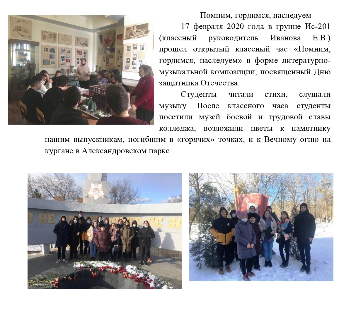 В рамках месячника военно-патриотического воспитания в НКПТиУ студенты Агротехнического отделения групп Нс-191 (классный руководитель Ейст Н.А.), Зем-181 (классный руководитель Юдина О.Н.), Зем-191 (классный руководитель Крымцева У.К.), Зио-193 (классный руководитель Калинина Л.С.), Вет-202 (классный руководитель Колот С.В.), Вет-203 (классный руководитель Мишустин В.А.) посетили историко-монументальные памятники города Новочеркасск, среди которых Мемориальный комплекс Курган Славы в Александровском парке, братские могилы советских воинов, погибших в годы Великой Отечественной войны, памятник воинам-интернационалистам,монумент«Память» в честь погибших выпускников Новочеркасского высшего военного командного училища.Эффективность использования памятников в патриотическом воспитании обусловлена тем фактом, что обучающиеся имеют возможность соприкоснуться с историей города и страны,приобрести новые знания и умения, почувствовать гордость за свою Родину. У каждого мемориала классными руководителями была представлена информация о его истории, после студенты торжественно возлагали цветы.