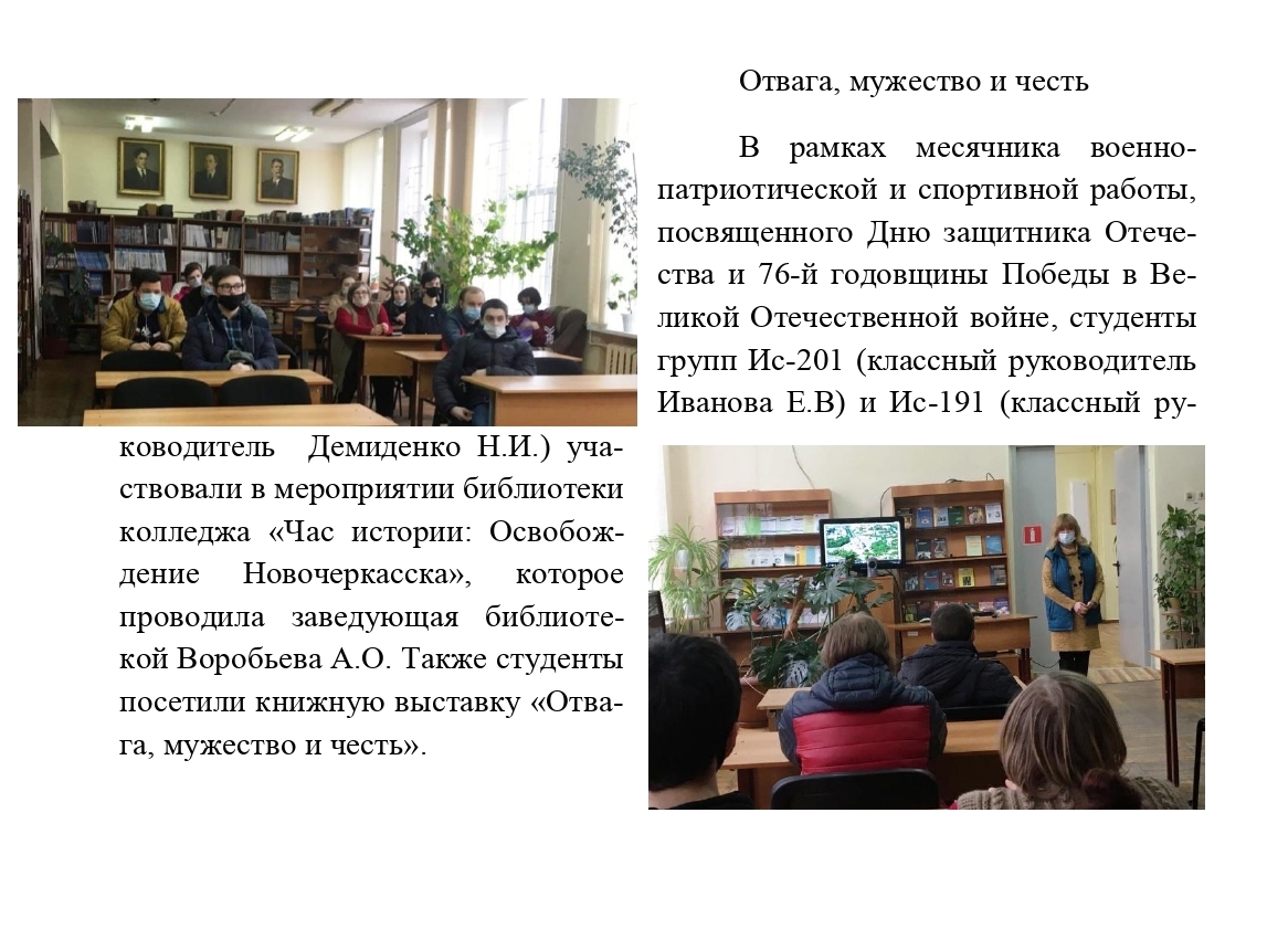 18 февраля 2021 г. в читальном зале ГБПОУ РО «НКПТиУ», в рамках реализации плана мероприятий по военно-патриотическому воспитанию, состоялся открытый классный час «Встреча с ветераном боевых действий», организованный классными руководителями Резвой Н.А., Богдановой Ю.В. и Быковской Ю.Н. для студентов групп ПК-201, Пк-191 и ПК-192 профессии «Повар,кондитер».