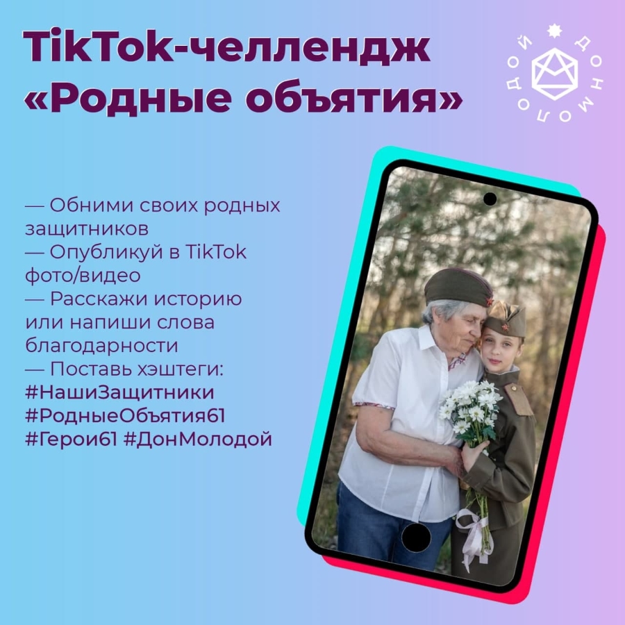 В социальной сети Tik-Tok выкладываются видео и фото контент, в которых молодые люди обнимают своих родных защитников: братьев, дедушек, бабушек, отцов и т.д. Публикации сопровождаются личными историями, словами благодарности и общими хэштегами #НашиЗащитники #Герои61 #ДонМолодой#colledg70
