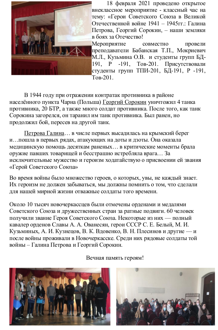 18 февраля 2021 года в группах Агротехнического отделения Вет-201 (классный руководитель Надькин В.Н.) и Вет-203 (классный руководитель Мишустин В.А.) в рамках месячника военно-патриотической работы был проведён тематический классный час «Подвигу народов жить в веках…». В ходе классного часа студентам была предоставлена информация о героях Великой Отечественной войны, Чеченской войны, боевых действиях в Сирии. Не были забыты и герои мирного времени. Полковник, ветеран боевых действий в Чеченской республике Надькин В.Н. рассказал о событиях войны в Чечне. Завершился классный час просмотром героических фрагментов из советского художественного фильма «Офицеры».