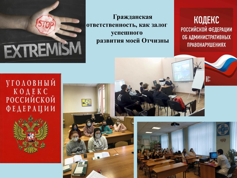 28 января в колледже прошел Единый классный час, для студентов 1-4 курсов, на тему: «Гражданская ответственность, как залог успешного развития моей Отчизны». Целью классного часа является воспитание правовой культуры обучающихся и профилактика преступлений и правонарушений среди молодежи.