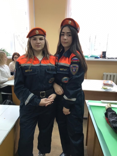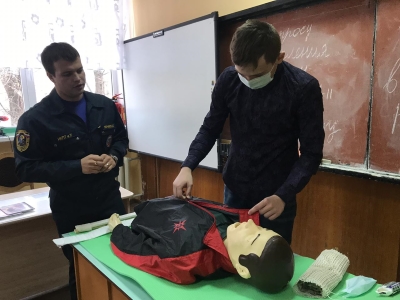 Школьники отработали порядок проведения закрытого массажа сердца на условном пострадавшем. Кроме этого, самые активные ребята надели боевую одежду пожарного, а девочки примерили на себе комбинезон спасателя и берет.
