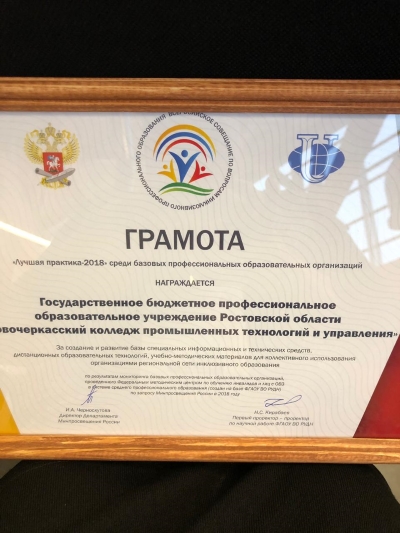 По результатам мониторинга базовых профессиональных образовательных организаций, проведенного Федеральным методическим центром по обучению инвалидов и лиц с ОВЗ в системе среднего профессионального образования по запросу Минпросвещения России в 2018 году, государственное бюджетное профессиональное образовательное учреждение Ростовской области «Новочеркасский колледж промышленных технологий и управления» награждено грамотой «Лучшая практика – 2018» среди базовых профессиональных образовательных организаций за создание и развитие специальных информационных и технических средств, дистанционных образовательных технологий, учебно-методических материалов для коллективного использования организациями региональной сети инклюзивного образования.