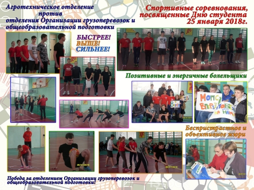 25 января в колледже прошли спортивные соревнования, посвященные Дню Студента. Эстафета прошла между студентами Агротехнического отделения и отделения Организации перевозок и общеобразовательной подготовки. В упорной борьбе команда Агротехнического отделения уступила команде Организации перевозок и общеобразовательной подготовки со счетом 10:12.