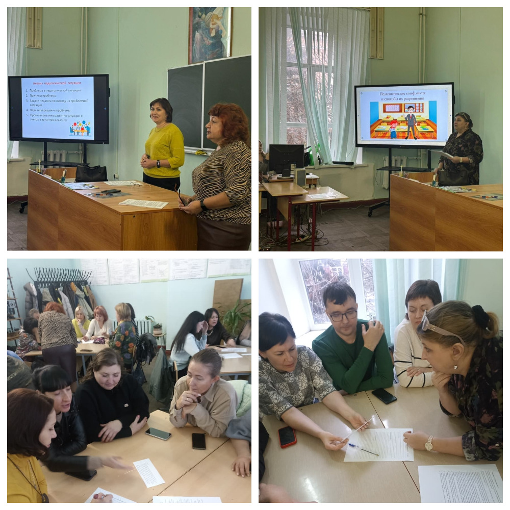 Педагог-психолог Галунова Анна Павловна рассказала о педагогических конфликтах и способах их разрешения. В мини-группах классные руководители отрабатывали навыки конструктивного взаимодействия с обучающимися через решение педагогических ситуаций. Классные руководители принимали активное участие в обсуждении разрешения предложенных конфликтных ситуаций, а также делились личным опытом работы.