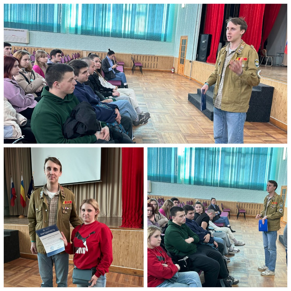 Представитель штаба Иван Смыслов рассказал студентам об активной работе Ростовского штаба студенческих отрядов совместно с организациями среднего профессионального образования Ростовской области по формированию и трудоустройству студенческих отрядов. Это позволяет студентам проходить оплачиваемую учебную и производственную практику по специальности и получать дополнительные профессиональные навыки, развиваться в творческой, спортивной деятельности, проявлять себя как лидеры и профессионалы.
