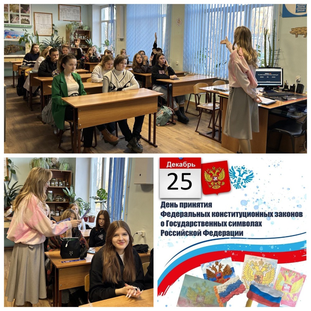 В этот день советник по воспитанию Елена Зайцева провела среди студентов специальности «Ветеринария» первых и третьих курсов интеллектуальный марафон «Государственные символы России».